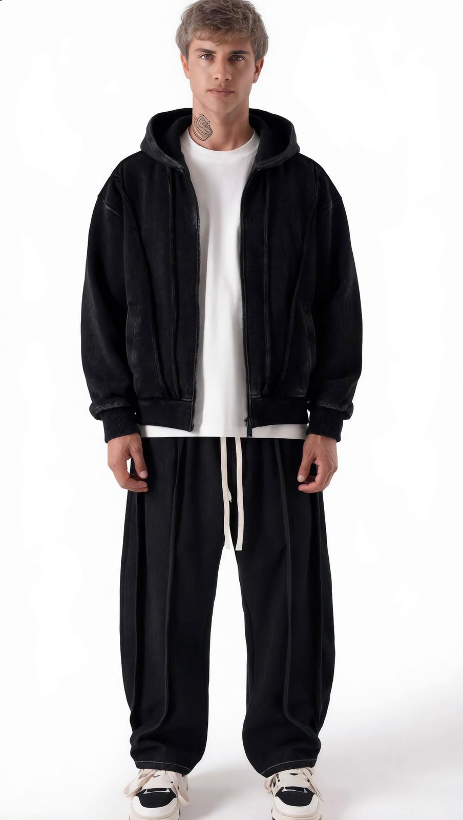 Il coordinato definitivo per chi non vuole passare inosservato. Questo set combina una felpa con cappuccio strutturata e pantaloni jogger abbinati, definiti da linee architettoniche che ridisegnano la silhouette urbana.